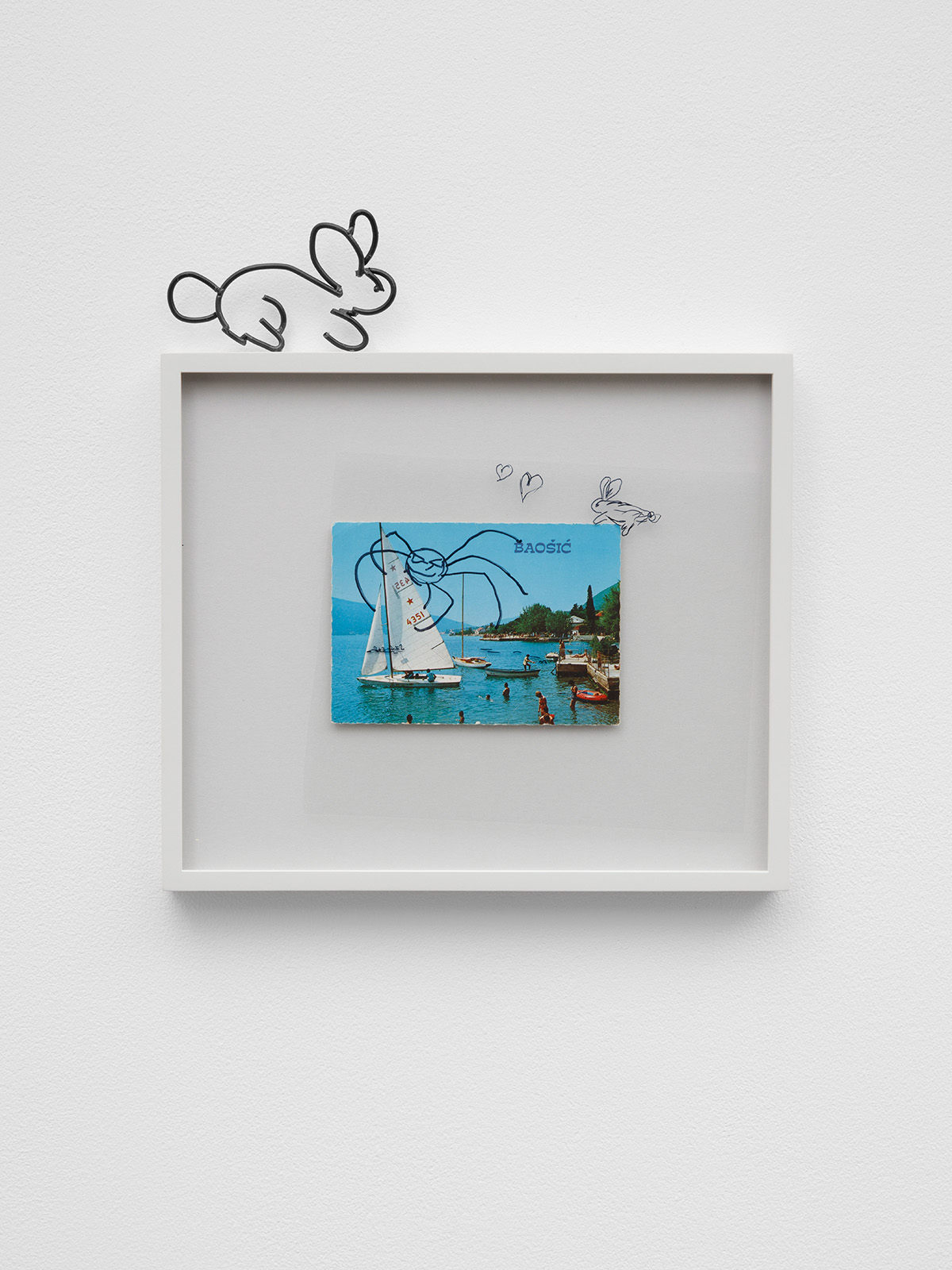 Petrit Halilaj, Abetare Postcard (Baošić with Spider, Bunny and Hearts), 2025; Postcard, ink, frame, metal; Overall: 34.1 × 31.6 × 3 cm. Photo by Giorgia Palmisano MBP